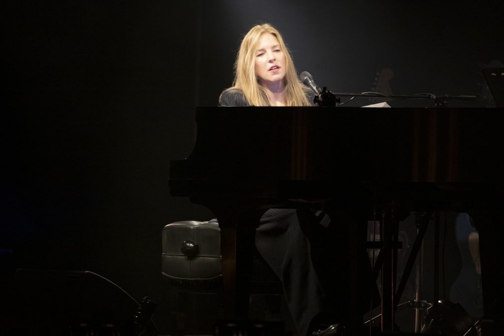 ダイアナ、トニー、マットが一緒にオーディエンスの前で音を出すのは、今回のツアーが初めてであるという。私は過去、いろんなフォーマットでダイアナのライヴを聴いてきたが、ドラムレス編成の時があってもギターが入っていななかったことはなかったと記憶する。それだけでも自分には、圧倒的に新鮮だ。しかも5月8日、初日である。「いったいどんな響きで魅了してくれるのだろう?」とわくわくしているうちに客席が暗くなり、トニー、マットが登場して位置につき、少し遅れてダイアナが現れる。1曲目は前述のアルバム『ディス・ドリーム・オブ・ユー』に入っていた「オールモスト・ライク・ビーイング・イン・ラヴ」。アルバム・ヴァージョンはピアノとギターが奏でる粋なイントロから始まっていたが、この日のトリートメントはもちろん異なる。おもむろにダイアナが歌い出し、そこにトニーが堅実なベース・ラインを重ね合わせる。ダイアナは客席としっかり目を合わせながらワン・コーラスを綴り、そこからピアノの鍵盤へと指を走らせていく。マットの優し気なドラムの音色が合流する頃には、広がりのあるTOKYO DOME CITY HALLも、親密感あふれる空間へと早変わりだ。バンドスタンドの中央にいる3人は非常に近い距離に集まってプレイを続け、シンプルで落ち着いた色彩を持つライティングや、ナチュラルな音質を重視すべく抑制を利かせたPAも、達人たちによる音の会話をさりげなく際立たせる。
