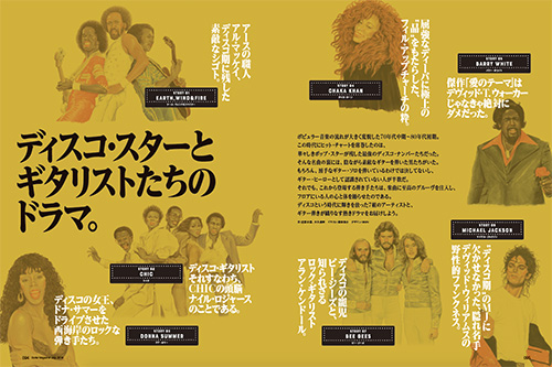 ポピュラー音楽の流れが大きく変貌した70年代中期~80年代初期。この時代にヒット・チャートを席巻したのは、華々しきポップ・スターが残した最強のディスコ・ナンバーたちだった。そんな名曲の裏には、陰ながら素敵なギターを弾いた男たちがいた。もちろん、派手なギター・ソロを弾いているわけでは決してないし、ギター・ヒーローとして認識されていない人が半数だ。それでも、これから登場する弾き手たちは、楽曲に至高のグルーヴを注入し、フロアにいる人の心と体を踊らせたのである。ディスコという時代に輝きを放った7組のアーティストと、ギター弾きが織りなす熱きドラマをお届けしよう。