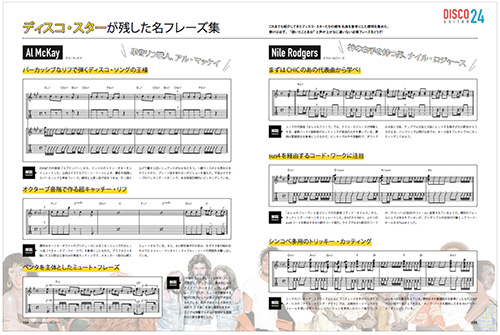 さあ、ここまで読み進めたギタリスト諸君ならもう、ディスコを弾きたくて体がウズウズしてきた頃だろう。ここでは超ド級の定番ディスコ譜例を一挙に掲載していく。しかも切り取ったのは楽曲のキモといえるおいしいフレーズ部分のみ。そこをくり返し弾くだけで“ディスコ・ギターはマスターした”と言っても過言ではない!? ディスコ・スターの名曲から、有象無象の定番ディスコまで、24のフレーズを弾き終えた頃には、夜はすっかり明け、朝を迎えているかもしれない……さっそく、ページをめくってディスコ・ナイトに突入だ!!