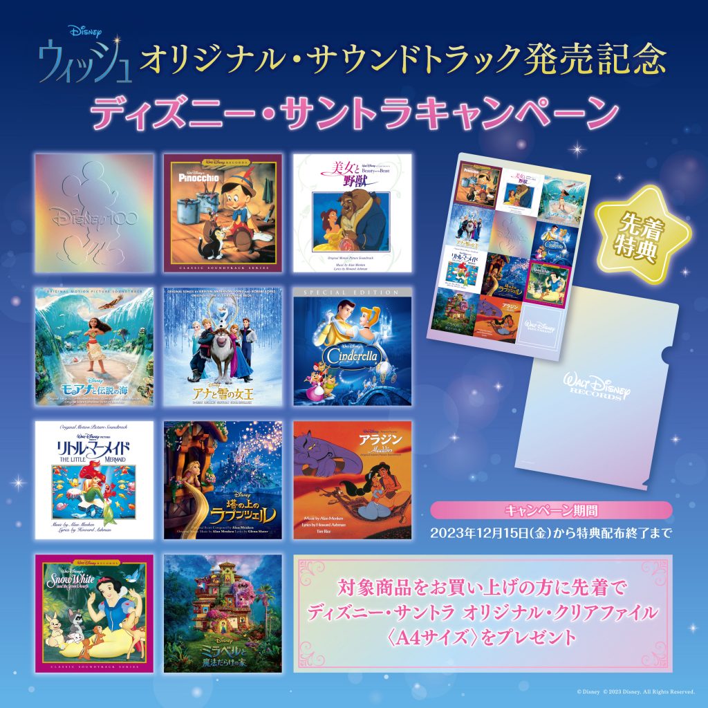 NEWS ALL TOPICS MEDIA LIVE/EVENT 2024.01.29 LIVE ディズニー100周年記念作品 映画『ウィッシュ』ドルビーアトモス特別上映会開催!Dolby Atmos®(ドルビーアトモス)を知って、音の世界に没入しよう! トークイベントの実施 2023.12.15 TOPICS 映画グッズが当たる!サントラ・アルバムライブラリ追加キャンペーン実施! 2023.12.15 TOPICS 『ウィッシュ』日本版オリジナル・サウンドトラック発売記念 年末年始に全国各地のスキー場でも『ウィッシュ』の音楽を楽しもう! 2023.12.15 TOPICS ディズニー100周年記念作品 映画『ウィッシュ』日本版オリジナル・サウンドトラック12月15日(金) CD発売/デジタル配信開始!豪華日本版声優&US版声優の楽曲を一挙収録! 2023.12.05 TOPICS 『ウィッシュ』日本版オリジナル・サウンドトラック発売記念 ディズニー・サントラキャンペーン 2023.12.05 TOPICS ディズニー映画最新作『ウィッシュ』日本版オリジナル・サウンドトラック発売記念パネル展~プレゼント・キャンペーン実施! 2023.11.28 TOPICS ディズニー映画最新作『ウィッシュ』より主人公アーシャ役の日本版声優を務める生田絵梨花が歌う「ようこそ!ロサス王国へ」が劇場公開に先駆けて配信開始!また、日本版オリジナル・サウンドトラックCDの全トラックリスト公開! 2023.11.17 TOPICS ディズニー映画最新作『ウィッシュ』日本版オリジナル・サウンドトラックCDのジャケット写真解禁!さらに、デラックス版にはボーナス・トラックなど追加も決定! 2023.11.13 MEDIA - WEB MOVIE WALKER PRESSにてコラム掲載!『白雪姫』から『ウィッシュ』へ!時代を映してきたディズニー・ヒロインの名曲をプレイバック 2023.11.10 TOPICS <Wish Wednesdays>第4弾シングル US版「誰もがスター!」Performed by キャスト 配信開始! 123123