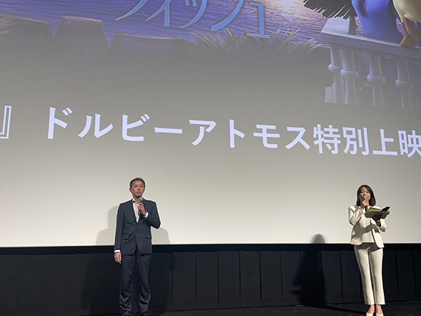ドルビーアトモスの劇場は天井にもスピーカが設置され、座席を囲むような音響設備となっています。従来のサラウンドシステムとは異なり、これらのスピーカを個別に駆動させることができるため、より繊細な音響の体験が提供される事、また劇場と同じ環境で音を収録していることから、作者の意図した通りの音響をお楽しみただけることをお話され、会場ではその後上映される『ウィッシュ』への期待感が高まりました。