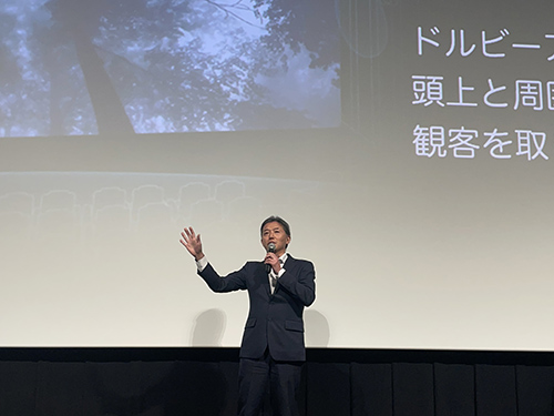 いつもより良い⾳響で映画を楽しめる・・とは知っていても、具体的にどのようなものなのかご存じない⽅も多いドルビーアトモスについて、ドルビージャパン シネマ&コンテンツソリューション部 部長の尾﨑卓也 (おざきたくや)さんは、「ドルビーアトモスとは、映画により入り込める最新鋭の立体音響技術です」とご説明され、日本のみならず世界中に広まっていることをお話ししました。