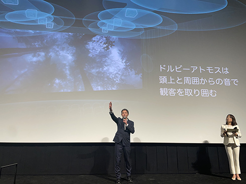 いつもより良い⾳響で映画を楽しめる・・とは知っていても、具体的にどのようなものなのかご存じない⽅も多いドルビーアトモスについて、ドルビージャパン シネマ&コンテンツソリューション部 部長の尾﨑卓也 (おざきたくや)さんは、「ドルビーアトモスとは、映画により入り込める最新鋭の立体音響技術です」とご説明され、日本のみならず世界中に広まっていることをお話ししました。