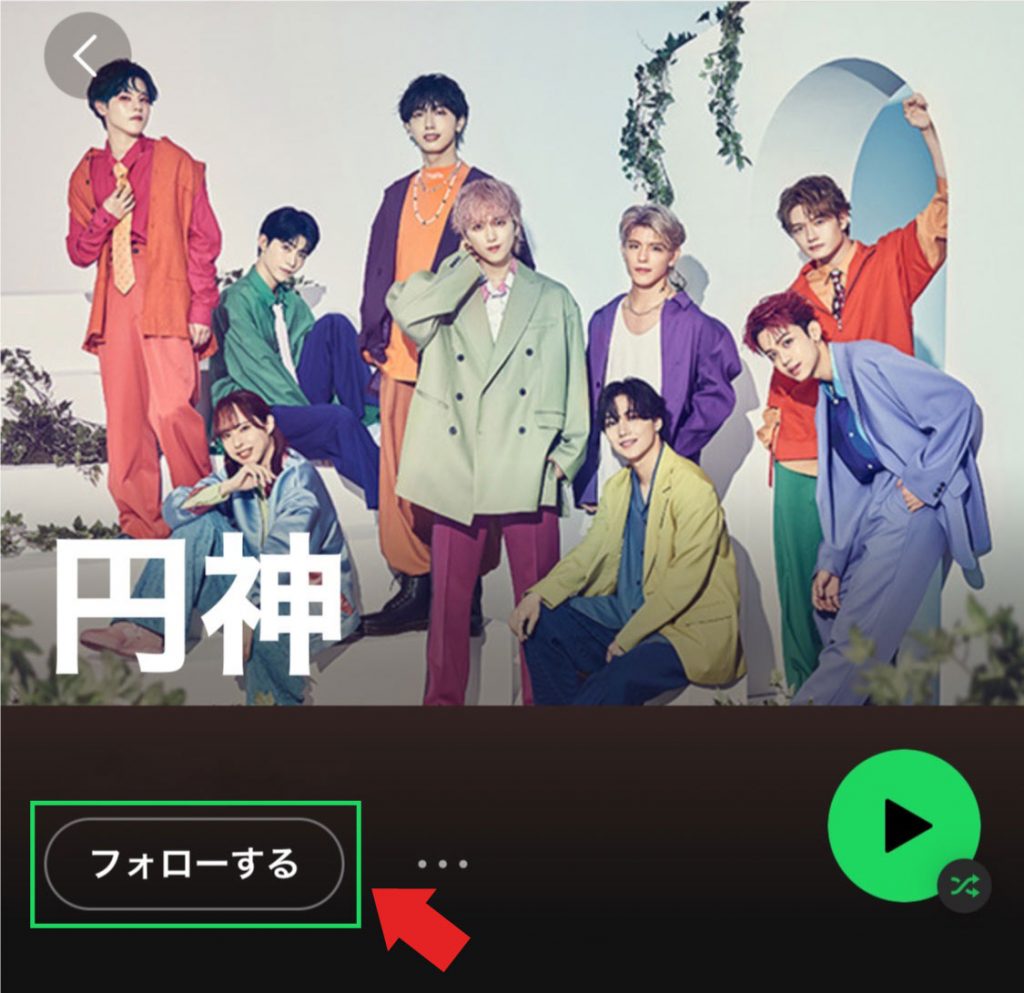 Spotifyにて円神のアーティストページを開き、「フォローする」をタップ