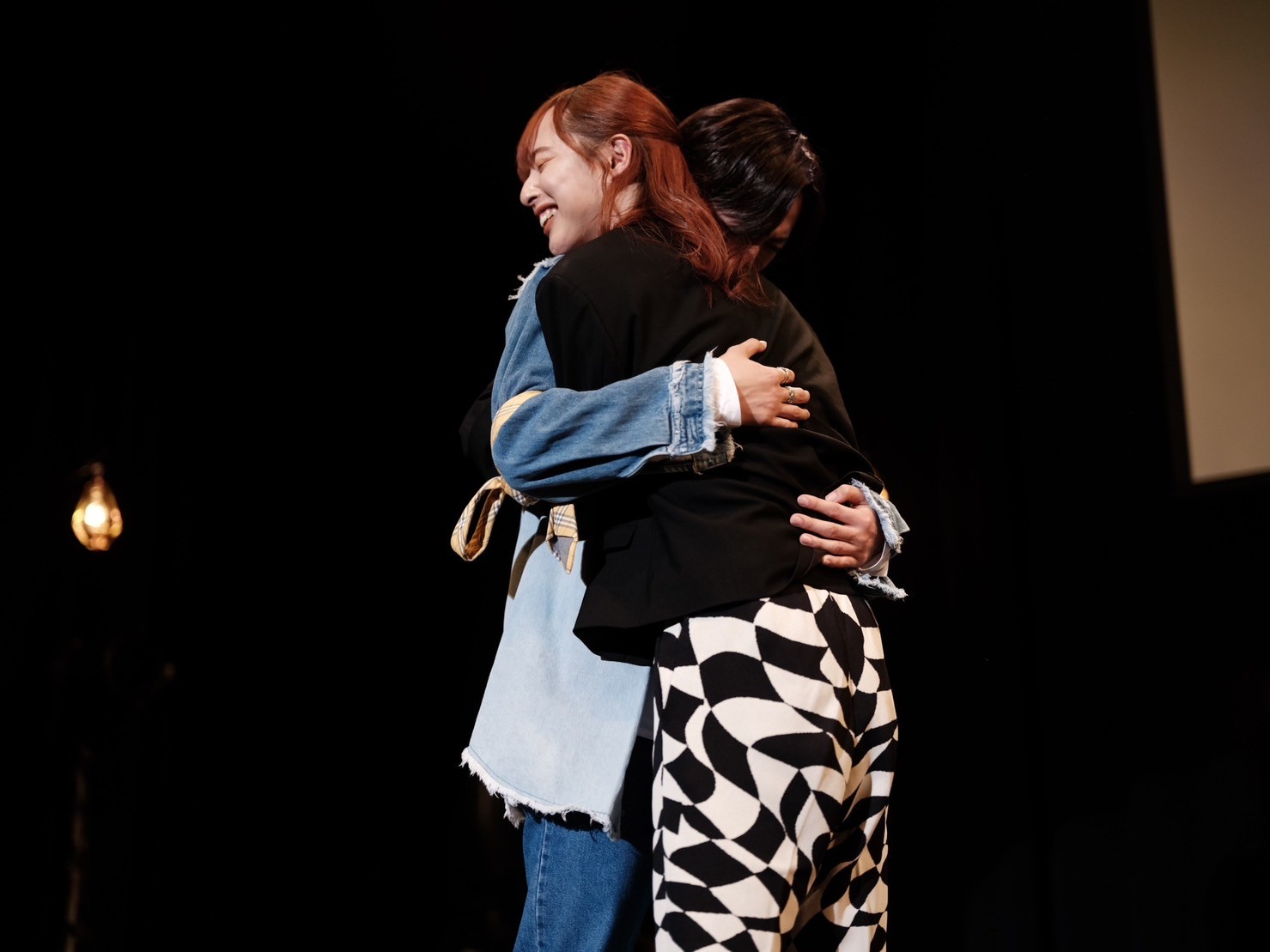 MU3Eの特大コールが響き渡る「We are ENJIN」、熊澤の柔らかな歌いだしが印象的な「MERRY GO ROUND」とブライトなナンバーが続く。舞台上にふたりっきりになった熊澤と草地は、和気あいあいと「OBENTO~お弁当の歌~」を披露。デビューステージ『nonagon~始まりの音~』から、ことあるごとにパフォーマンスしてきたナンバーなこともあり、会場の一体感も抜群だ。曲中でふたりが向き合いシーンでは、草地が熊澤に手紙を渡す一幕も。思わぬサプライズを受けた熊澤は「いつも手紙を渡す側だったので、もらったらこんなに嬉しいんだな」と照れと感動の入り混じった表情で語った。