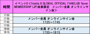 ※イベントE<メンバー全員 オンラインサイン会>はfromis_9 GLOBAL OFFICIAL FANCLUB flover MEMBERSHIP (JP)会員限定の特典会です。