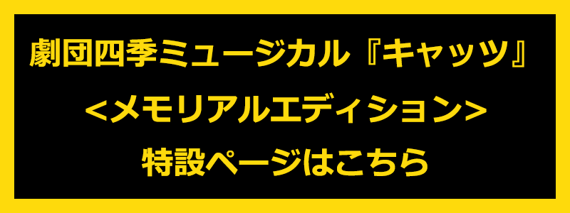 NEWS 2019.04.22 TOPICS 招き猫発祥の地、今戸神社へ猫たちが参拝!ミュージカル『キャッツ』ロングラン&最新版CDヒット祈願! 2019.04.19 LIVE 『キャッツ』の猫たちが今戸神社(東京都台東区)を参拝します! 2019.04.10 TOPICS 「劇団四季ミュージカル『キャッツ』<メモリアルエディション>」iTunesプレオーダー(予約)中! Twitterで、『キャッツ』のポスタープレゼント特別企画を実施! 2019.04.10 TOPICS 池井戸潤・遼河はるひのアルバム感想コメント到着!!「メモリー」単曲先行配信開始!iTunesアルバム予約開始! 2019.03.26 TOPICS 「劇団四季ミュージカル『キャッツ』<メモリアルエディション>」全曲試聴映像公開!豪華BOX商品写真公開! MORE