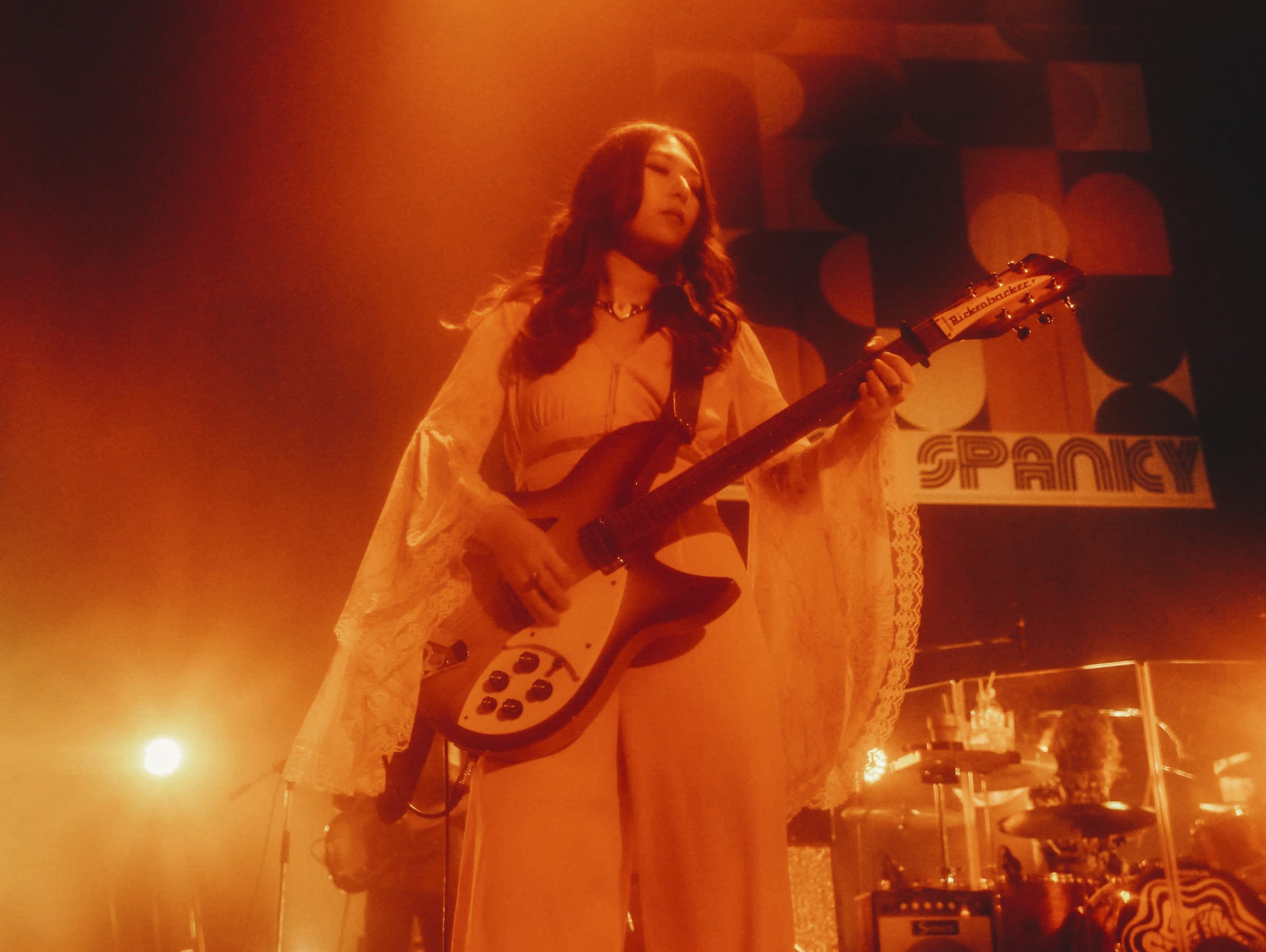 ステージは終盤へ。前述したようにジャンルの幅を広げた『Walking On Fire』のなかでも、トラディショナルなロックの真ん中を射抜く精神は忘れない「Singin’ Now」、陽のサイケポップ「The Flowers」ではタイトル通りの派手で鮮やかな照明の演出で楽しませてくれた。そして濃厚でブルージーなナンバー「いざメキシコへ」に対して、同じサイケなダンスナンバーでも、2015年にTame Impalaがアルバム『Currents』でエレクトロを大胆に取り入れ、サイケとポップの関係性を新たに構築しシーンの流れを変えたことと共鳴するドリーミーな「In the air」から、ハンズクラップや大合唱できるコーラスの効いた、シンプルでパワフルなロック「NEXT ONE」へ。冒頭で示した色とりどりのGLIM SPANKYさながらの豊かな引出しを、再びここで展開した。