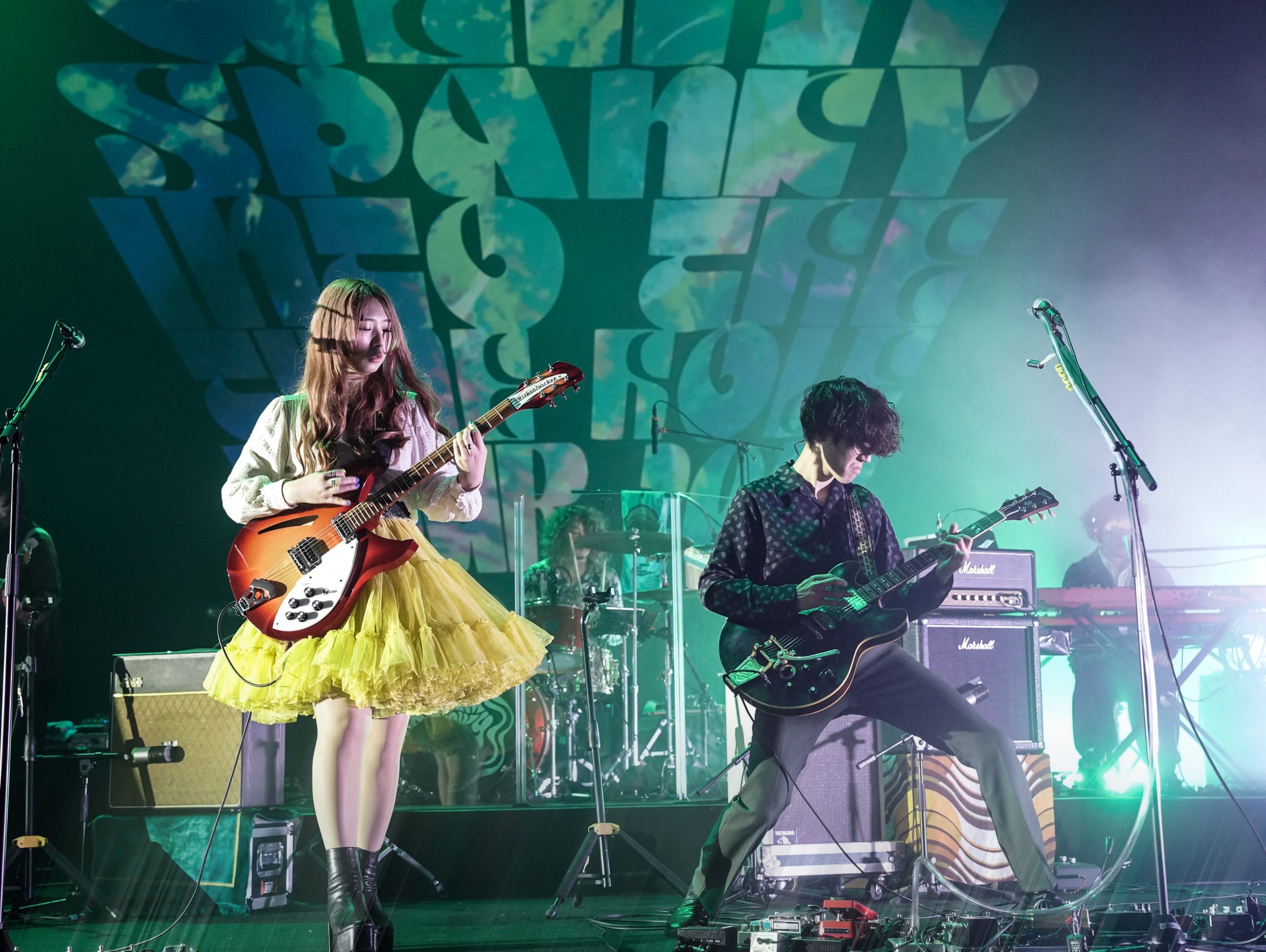 続くミステリアスな鍵盤のフレーズと軽快なビートのマッチングが心地良い「HEY MY GIRL FRIEND!!」から陽のサイケデリックナンバー「It’s A Sunny Day」ではハッピーで開放的な景色が広がる。その上で鳴り響いた珠玉の田園フォークバラード「美しい棘」では、うっとりしている観客もいれば、そのメロディに感情を爆発させ拳を上げる観客も。そこからうってかわってスリリングでヘビーなダークサイドからのブルースロック「Breaking Down Blues」では凄まじい一体感が生まれる。そして、「こんな時代に背中を押してくれるのはロックンロールだと思いませんか!」と松尾が叫んで演奏されたシンプルなロックンロール「時代のヒーロー」、松尾の赴き深いビンテージのアコースティックギターの音色に始まりサイケの深みへと誘うように鍵盤やギターの色が重なっていく「Looking For The Magic」、まさにベルベットなソファーが並ぶ昭和のキャバレーから宇宙へとトリップするような「Velvet Theater」、90年代のR&Bからのインスパイアを感じる「レイトショーへと」と、西暦も和暦もさまざまなジャンルもハイブリッドされた、ロックの自由を謳歌するめくるめく“GLIM”な世界と“SPANKY”な世界。そしてそのパフォーマンスに応える観客が織りなす景色こそ、GLIM SPANKYなのだと強く感じた。