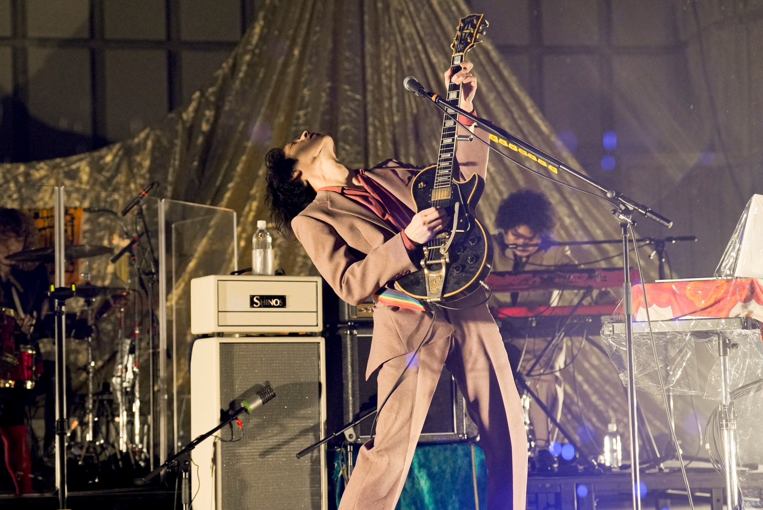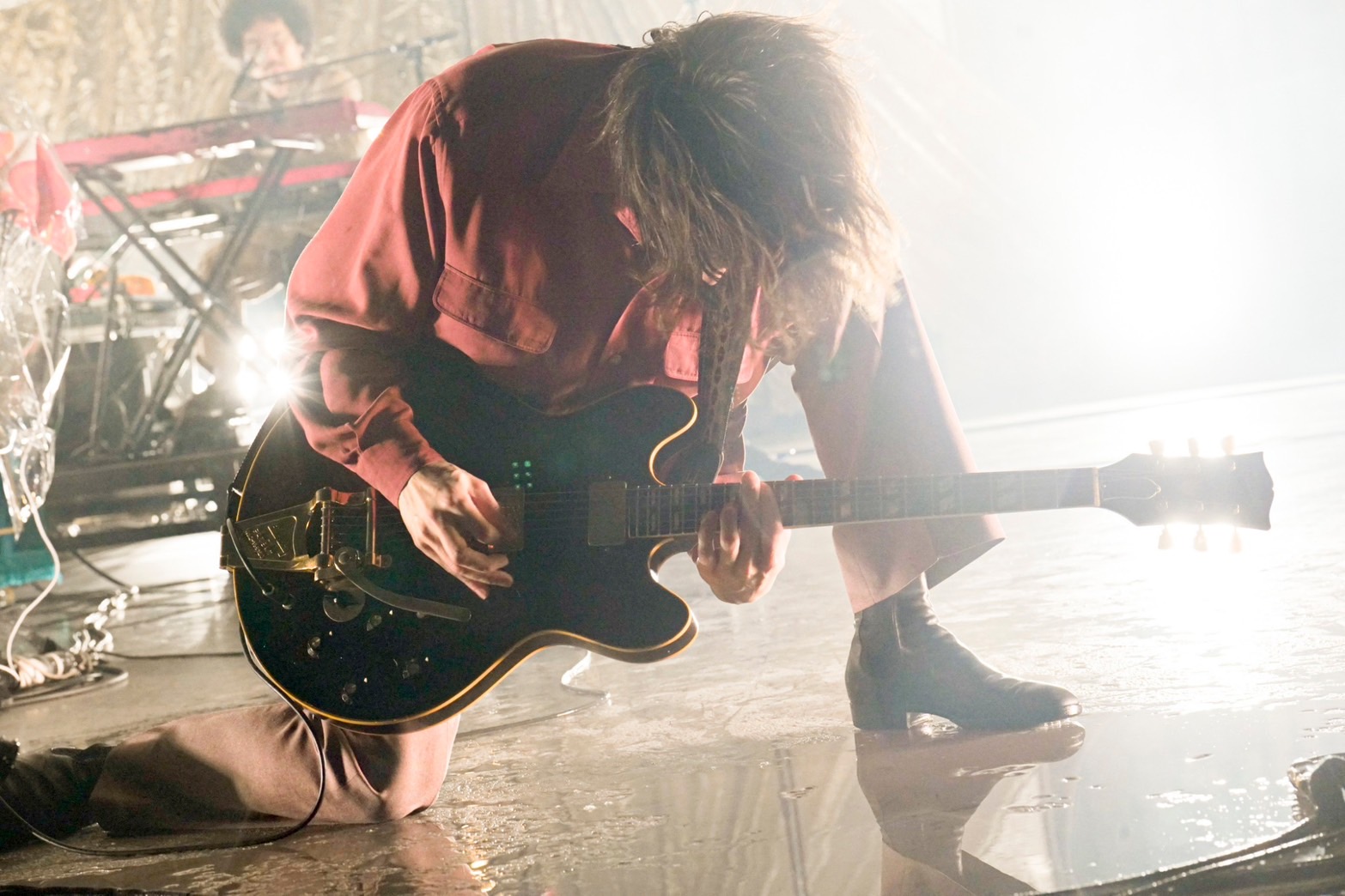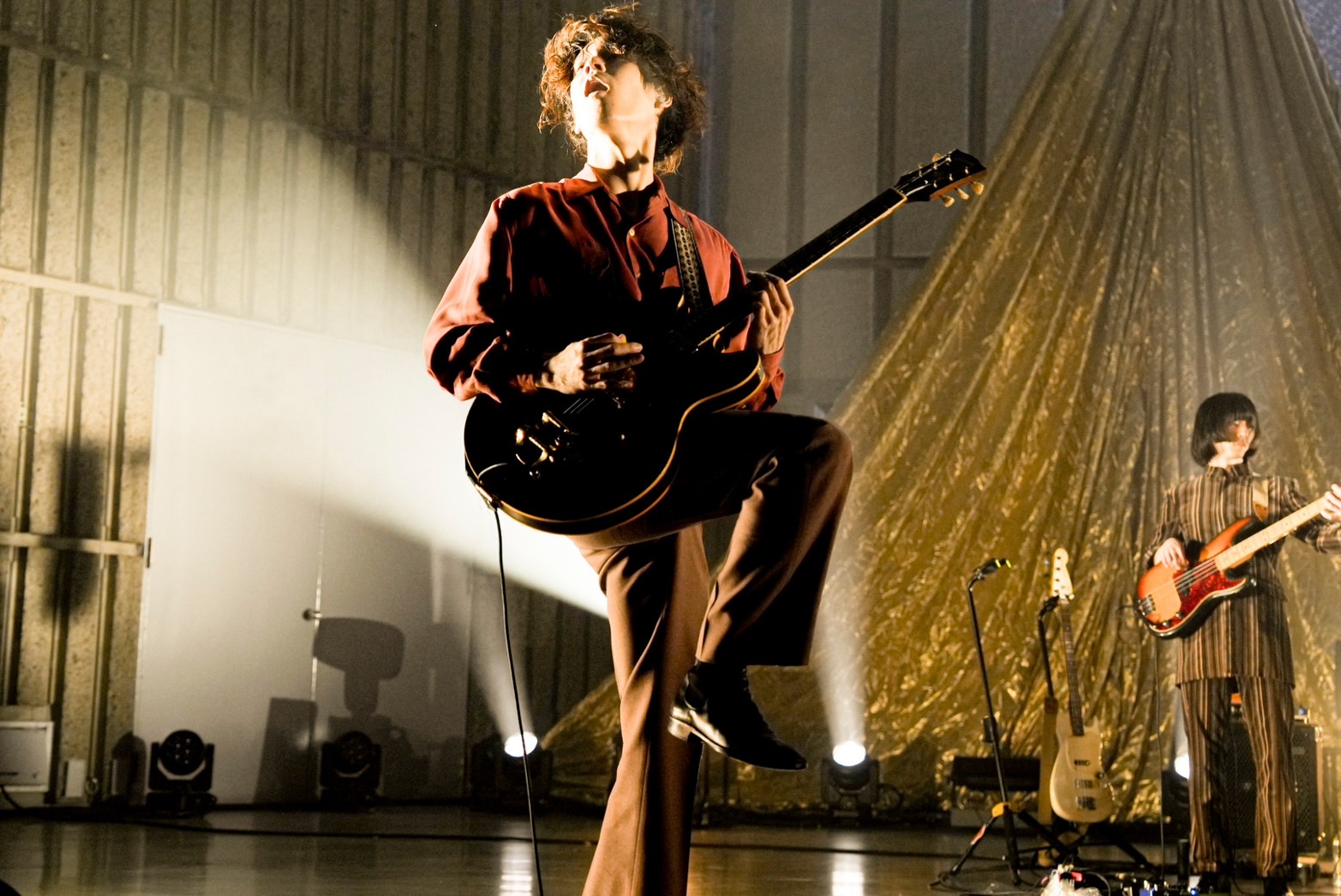 そんな2曲によって浮かぶ田舎の風景からロックの深い森へと手招きするように、『The Goldmine』収録の「真夏の幽霊(Interlude)」が始まる。松尾と亀本による二本のアコースティックギターが演出するサイケな音色や揺らぎは、雨という悪条件をスペシャル感に変える魔法のよう。アルバムと同じ流れで続く「Summer Letter」の、本来は晴れ晴れとしたサイケデリックロックと、野音の濡れた木々との相性が実に趣深い。そこからこちらも『The Goldmine』に入っている「Glitter Illusion」へ。横乗りでじわじわとムードを高めながらロックならではのダイナミックな魅力が重なってくる演奏に、再び場内の温度が高まってくる。そしてロックのど真ん中を射抜く初期のキラーチューン「NEXT ONE」で爆発。ニューアルバムで獲得した曲やアレンジのバリエーションが、グラデーションを楽しみながら多様な世界観を往来できる、ライブでの新たな魅力に寄与していることを強く感じた場面だった。