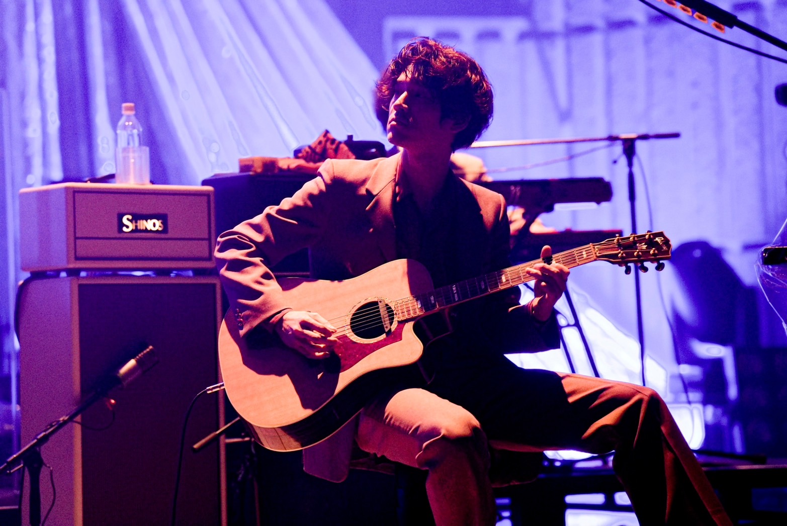 松尾が、ステージの背景に吊るされた大きな三角の布を指して「自分たちの育った長野県の村を囲む山脈もイメージしている」と話し、「光の車輪」へ。前3曲のアッパーなノリからシームレスに優しい田園フォークの世界へと誘う、絶妙な力加減と緩急が光るビートが心地良い。次の曲も長野の緑が浮かぶような「話をしよう」。その演奏が始まると場内のあちこちから「お~っ」という声が。それもそのはず。なぜなら2016年にデジタルシングルとしてリリースされ、そのグッドメロディが人気を博すも、ライブではあまり耳にすることのなかった曲だからだ。松尾曰くファンからのメッセージがきっかけで、今回のセットリストに組み込んだそう。
