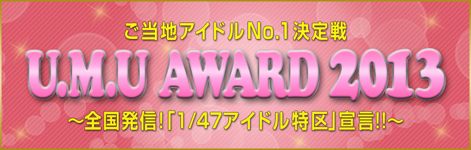 U.M.U AWARD 2013 開催決定! 2013.11.28 TOPICS 今年も、開催が決定致しました! ご当地アイドルNo.1決定戦 U.M.U AWARD 2013〜全国発信!「1/47アイドル特区」宣言‼〜 投票バトル会場はこちらです↓ https://s360.jp/form/30571-2208/