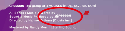 ブックレット巻末のクレジット表記にてGReeeeN、プロデューサーJIN氏の名前が、重なって印刷されている。