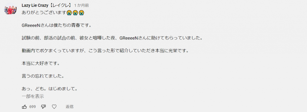 参考レイクレのGReeeeNパロディ動画https://www.youtube.com/watch?v=grZnKdotlZc&t=1s レイクレによるGReeeeN歌唱https://www.youtube.com/watch?v=shrr9dckO24 GReeeeNがレイクレのYouTubeコメント欄に投稿
