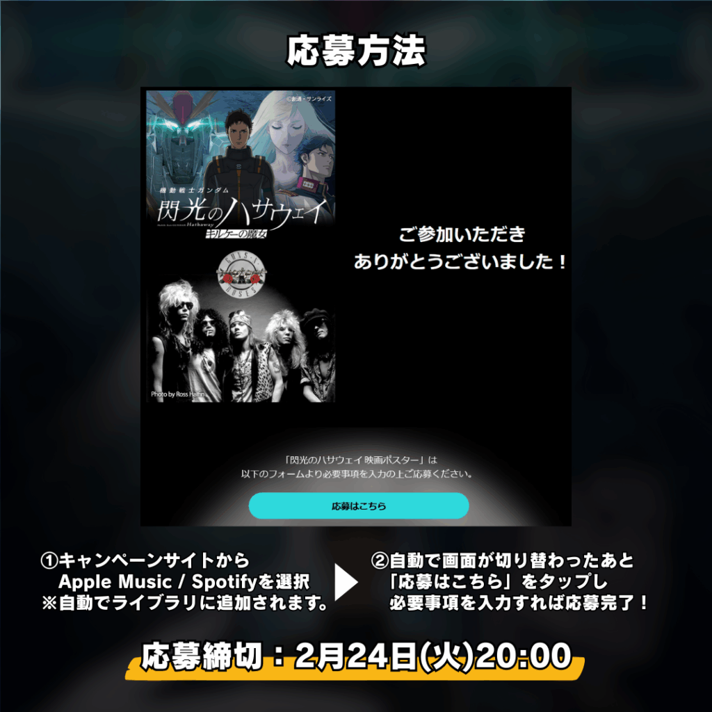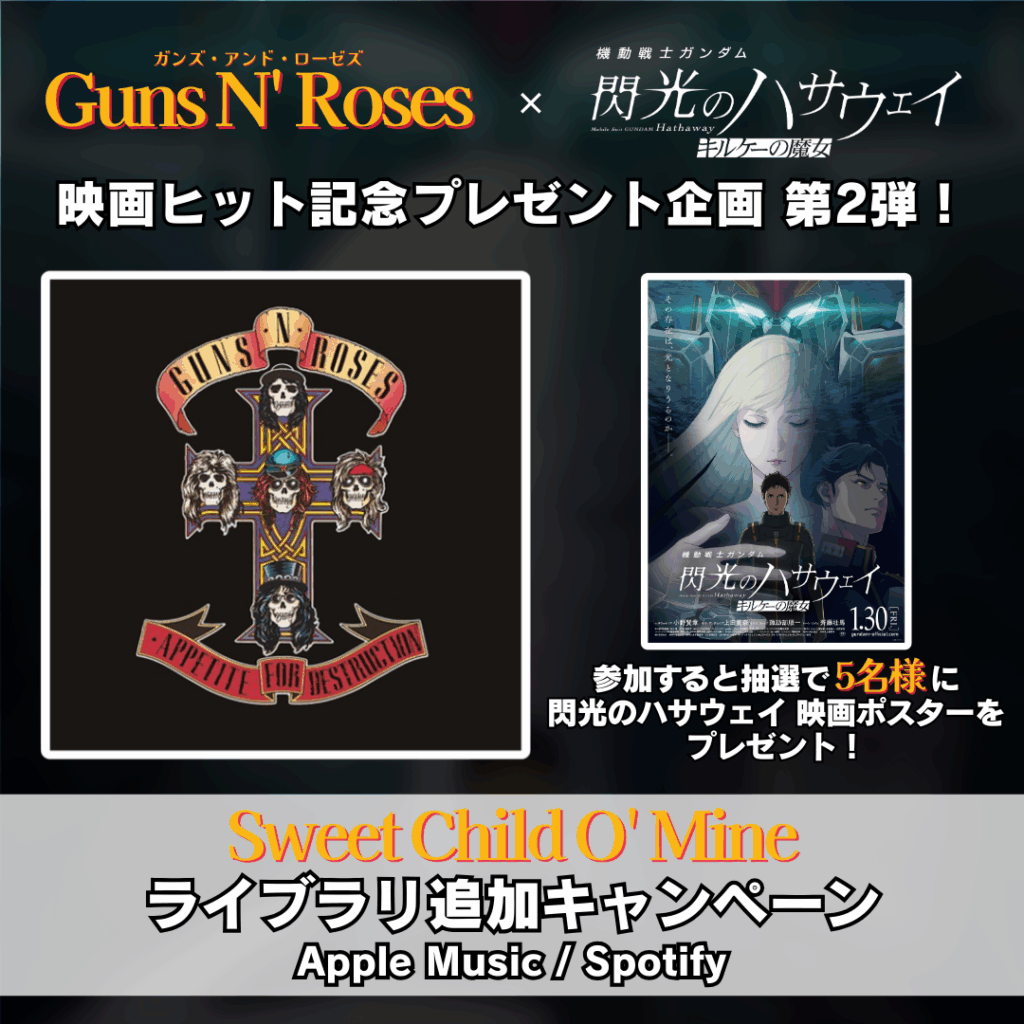 SpotifyかApple Musicで「Sweet Child O’ Mine」をライブラリ追加して応募すると、抽選で5名に「閃光のハサウェイ 映画ポスター」がプレゼントされる。