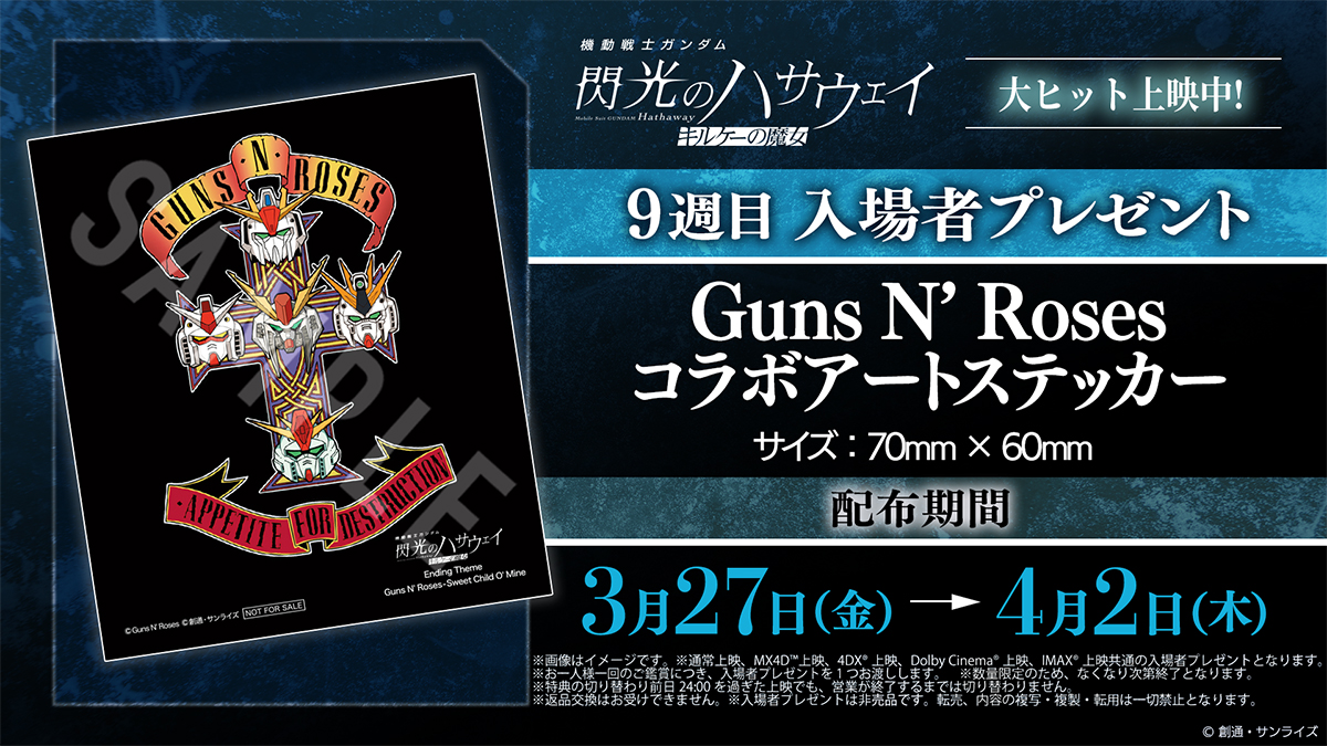 『機動戦士ガンダム 閃光のハサウェイ キルケーの魔女』9週目入場者プレゼントとしてGuns N’ Roses コラボアートステッカーの配布が決定!