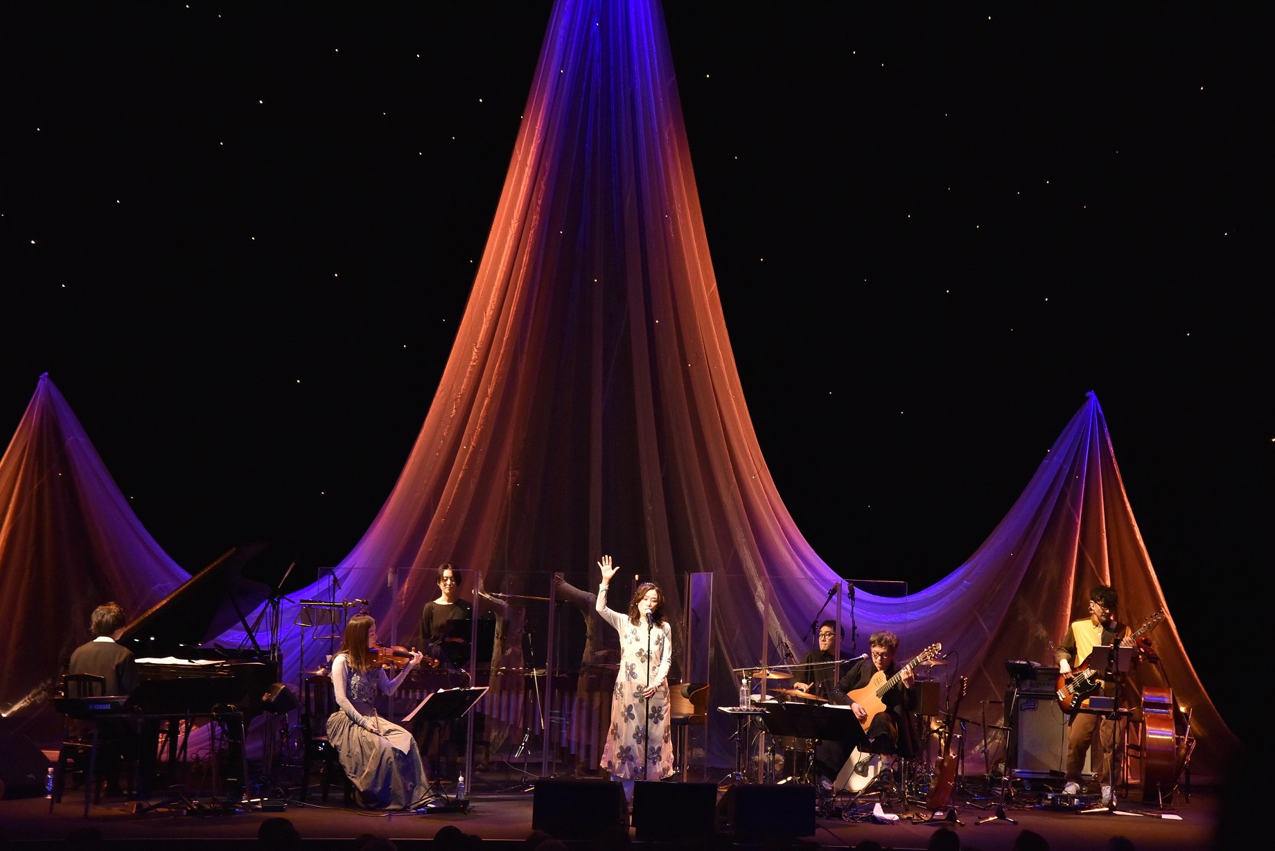 1曲目は新作『カリン』から、藤原さくらが作詞で参加した「朝に」。朝のアンニュイな雰囲気を湛えたナンバーを原田はしっとりと歌い、一気に観客を惹き込んだ。続いて演奏されたのは「雨音を聴きながら」と「「燃える太陽を抱いて」。いずれも1997年発表のアルバム『I could be free』に収録された隠れた名曲で、後者は“今回ライヴで初めて披露する曲”だという。オリジナルはトーレ・ヨハンソンのプロデュースによるスウェディッシュポップ・サウンドだったが、伊藤ゴローがライヴ用にアレンジし、現在の原田知世に合う大人っぽいサウンドに仕上げていた。
