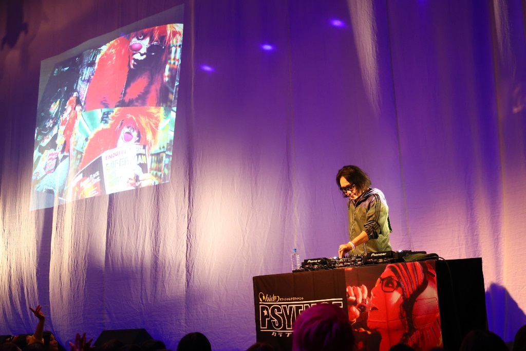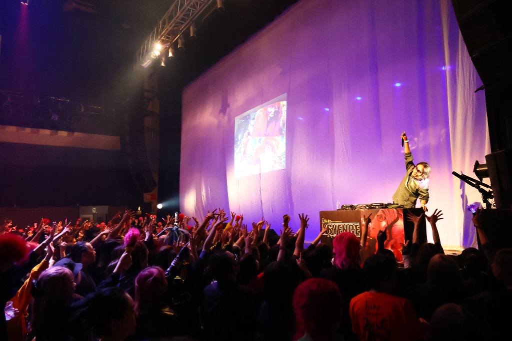 続いて登場したのは、DJ-INA。hide with Spread Beaveであり、いわずと知れたhideの全ての楽曲の共同プロデューサーである。ド派手なヘアスタイルの印象が強いINAであるが、この日は黒髪でファッションも地味目。「コロナ禍を経て4年ぶりくらいのDJ-INAなんですけど、HEATHのこともあってどんな顔して出てこようかなと……。いつも酔っ払ってDJやってるんだけど……」と語り始める。PATAやHEATHと一緒に作った「CELEBRATION」のトリビュートの話になると、万感の想いがこみ上げて言葉に詰まりそうになってしまう。「考えていて何もやらないより、一歩踏み出してみましょう。ロケットダイブ的な気持ちで、今日もそう思ってここにきました。今日のDJはHEATHに捧げようと思ってます」といって、思い出の曲「CELEBRATION」からDJタイムがスタートした。悲しい想いを振り切るように、フロアを盛り上げるINAに観客も精一杯の歓声で応える。X JAPANの「Rusty Nail」ではイントロで白煙が上がり、音源がライブバージョンなので観客の声が入っていて、臨場感あふれるDJタイムだった。