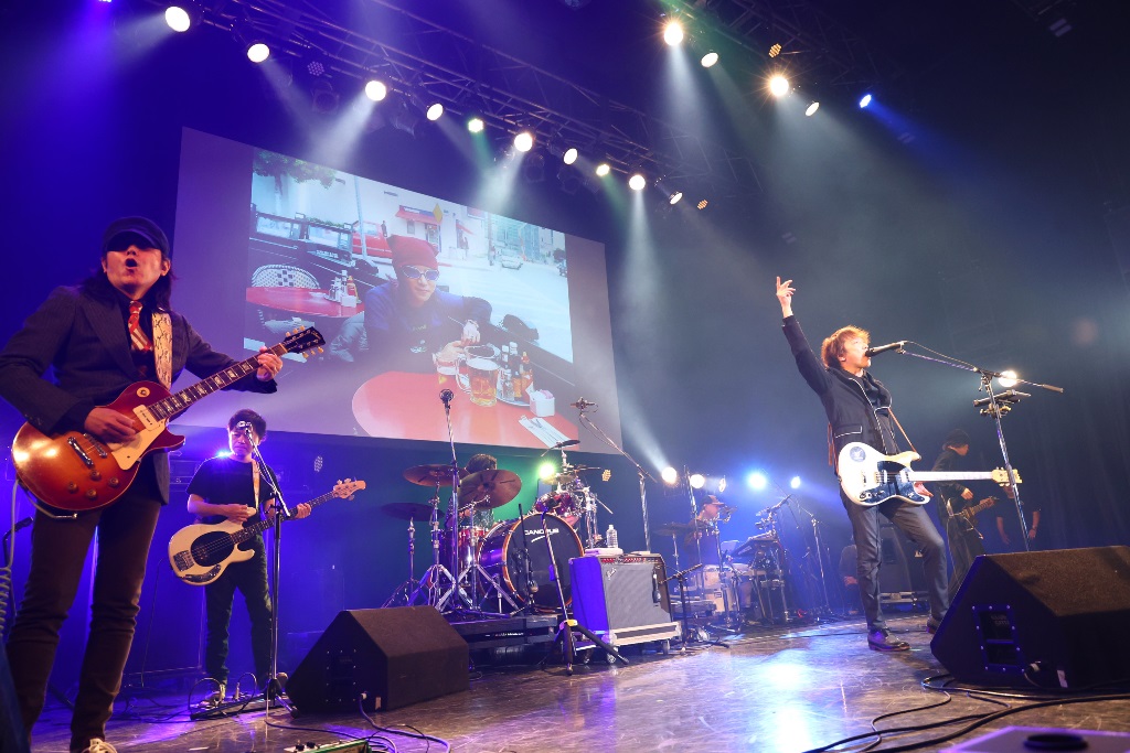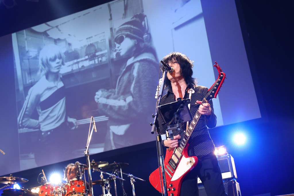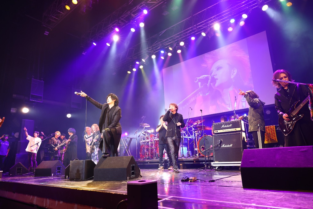 そして、TAKAの「あの方を呼びこみたい」という声で、会場中の大きな歓声に迎えられたのはhideの盟友PATA。やはりこの方が登場してくれないと、このパーティは終わらない。大盛り上がりの中、PATA+defspiralの「CELEBRATION」が演奏され、そのまま今日の全ての出演者が登場して「TELL ME」の大セッションへとなだれこむ。マイクを持つ人、楽器を持つ人、ステージ上で遊んでいる人(?)、出演者全員が思い思いに楽しんでいて、スクリーンのhideがそれを目を細めて見つめているように見える。