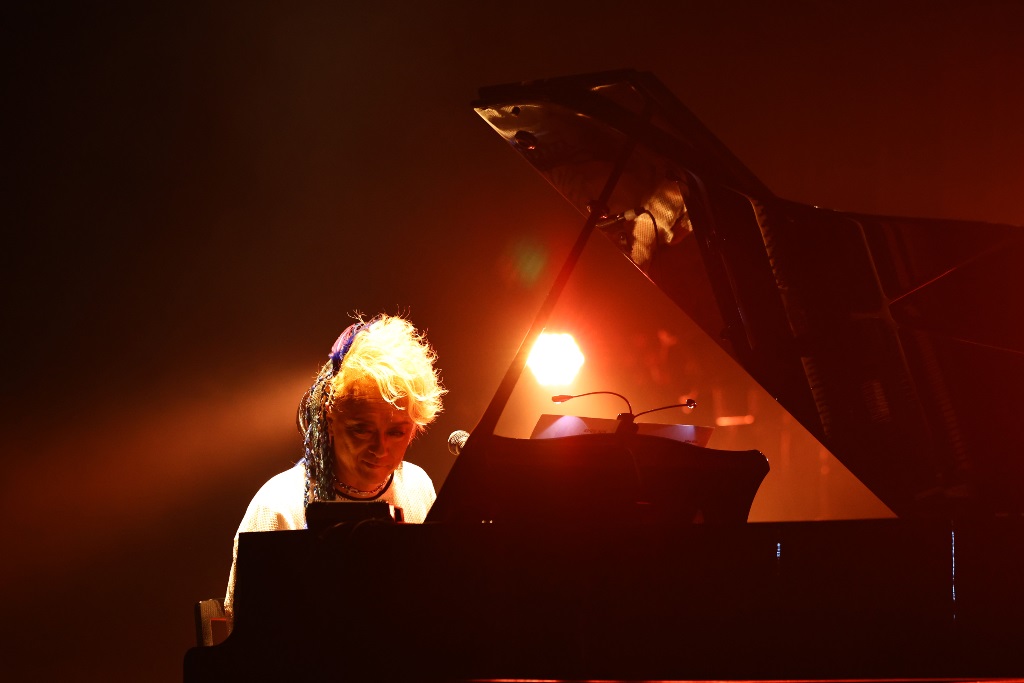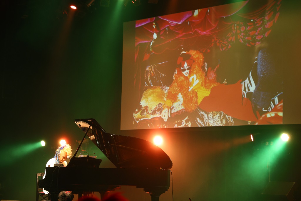 続く二番手は、hide with Spread BeaverのキーボーディストDIEのソロステージ。昨年に続き、グランドピアノでの弾き語りである。昨年は「眠れる音楽を追求した」というピアノアルバムをフィーチャーしたステージを見せてくれたが、今年は1曲目の「BLOOM」からアグレッシブ。アンビエント系の楽曲にも関わらず、ステージ上手には猫砂を使って作ったというデジタルサウンドエフェクト、下手にはシンセとボコーダーを置き、グランドピアノと3カ所を回って浮遊感のある実験的な音楽を創り出していた。1曲目で観客の度肝を抜く演奏を披露したDIEであるが、「ピンク スパイダー」をボサノバ風にピアノでアレンジしたり、軽快にピアノの弾き語りを聞かせてくれる。ラストは「お月様の歌です。hideちゃんもひーちゃん(HEATHの愛称)も同じ月を見ててほしいなと思います」と語った後、気持ちのこもった「THE SAME MOON」でステージを締めくくった。