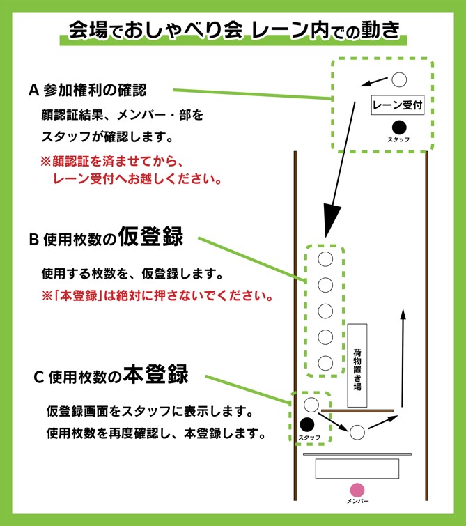 <「会場でおしゃべり会」ご参加の流れ[レーン入場~権利使用につきまして]>