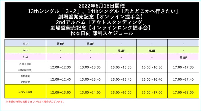 13thシングル『3-2』、及び14thシングル『君とどこかへ行きたい』の松本日向の参加権利をお持ちの方、並びに2ndアルバム『アウトスタンディング』2月5日(土)・6日(日)「オンラインロング握手会」振替開催4月23日(土)、24日(日)分の松本日向の参加権利をお持ちの方を対象に、5月23日(月)より「オンライン握手会申込サイト」にて、6月18日(土)、19日(日)振替開催「オンライン握手会」「オンラインロング握手会」「会場でおしゃべり会」の第1次〜5次抽選受付を行いますので、受付方法・注意事項をご確認の上、お申込みください。