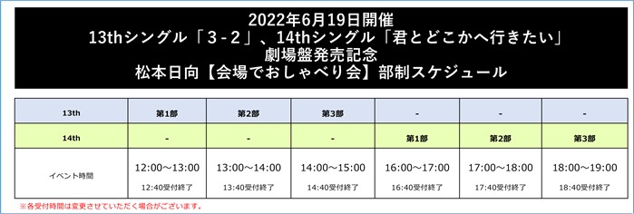 「会場でおしゃべり会」「オンライン握手会」につきましては、13thシングル『3-2』、及び14thシングル『君とどこかへ行きたい』の松本日向の参加権利をお持ちの方が対象となります。