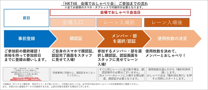 「会場でおしゃべり会」は、従来の「握手会」で使用しておりました紙の「参加券」の発行をなくし、お客様のスマートフォンを用いた新たなシステムの導入しております。