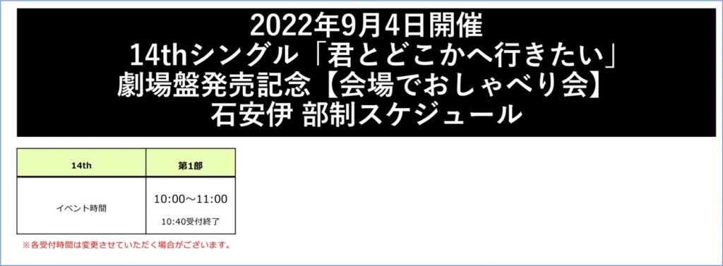 先般、卒業発表いたしました石安伊につきまして、14thシングル『君とどこかへ行きたい』劇場盤発売記念「会場でおしゃべり会」「オンライン握手会」振替開催が決定しましたのでお知らせいたします。