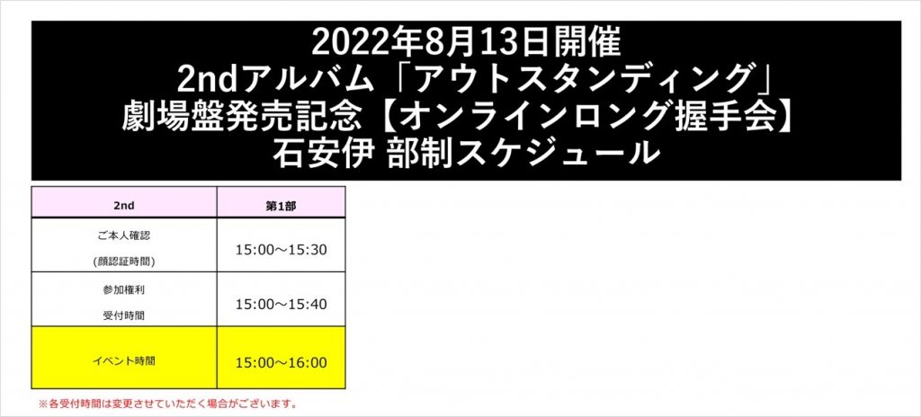2月5日(土)、6日(日)2ndアルバム『アウトスタンディング』劇場盤発売記念「オンラインロング握手会」の振替開催 4月23日(土)、24日(日)分、1月29日(土)、30日(日)2ndアルバム『アウトスタンディング』劇場盤発売記念「2ショット写真会」の振替開催 6月25日(土)、26日(日)分、「オンラインロング握手会」におきまして視聴不具合により参加権利をお戻ししている方を対象に、7月30日(土)より「オンライン握手会申込サイト」にて、8月13日(土)振替開催「オンラインロング握手会」の第1次〜第3次抽選受付を行いますので、受付方法・注意事項をご確認の上、お申込みください。