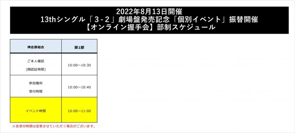 2022年8月13日(土)振替開催 神志那結衣、松岡菜摘「オンライン握手会」「オンラインロング握手会」につきまして