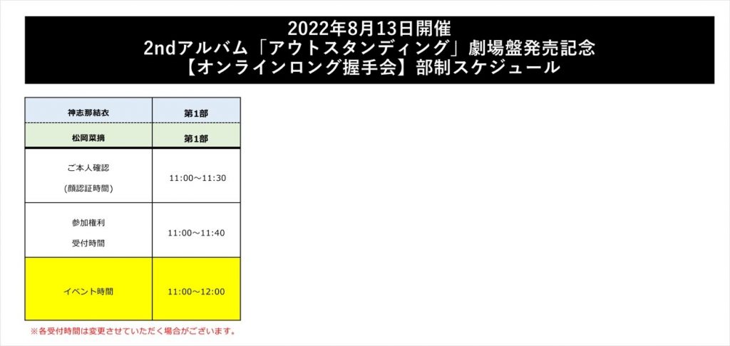 ※各部「ご本人様確認(顔認証)」「受付時間(使用枚数選択)」「イベント時間(オンライン握手会)」3つの時間帯があり、それぞれ受付開始/終了時間が異なりますので、ご注意ください。