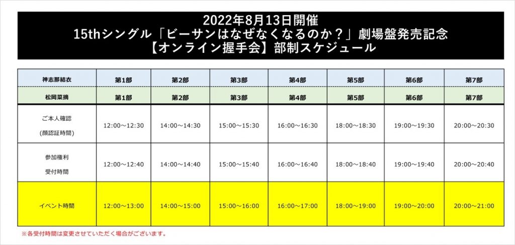 ※「オンライン握手会」の受付(使用枚数選択)は、各部「イベント終了時間」の20分前に終了させていただきます。