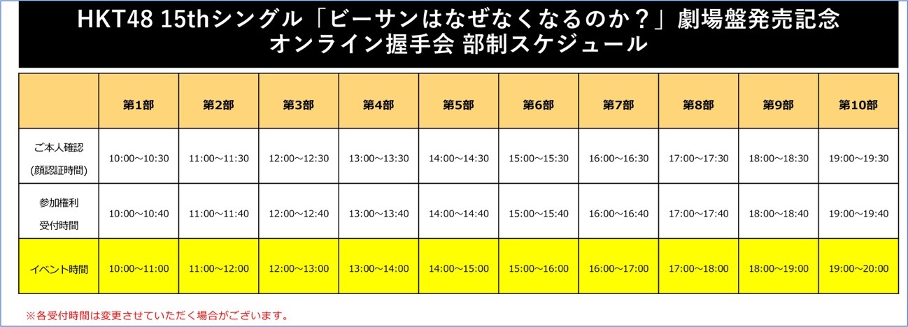 ※各部「ご本人様確認(顔認証)」「受付時間(使用枚数選択)」「イベント時間(オンライン握手会)」3つの時間帯があり、それぞれ受付開始/終了時間が異なりますので、ご注意ください。