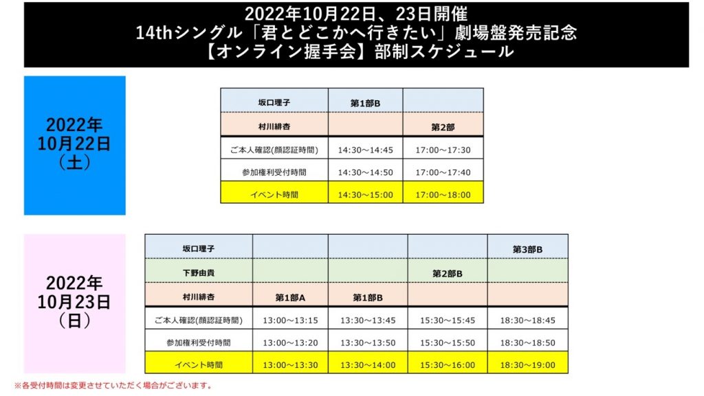 2022年10月22日(土)、10月23日(土)振替開催 坂口理子・下野由貴・村川緋杏「オンライン握手会」につきまして