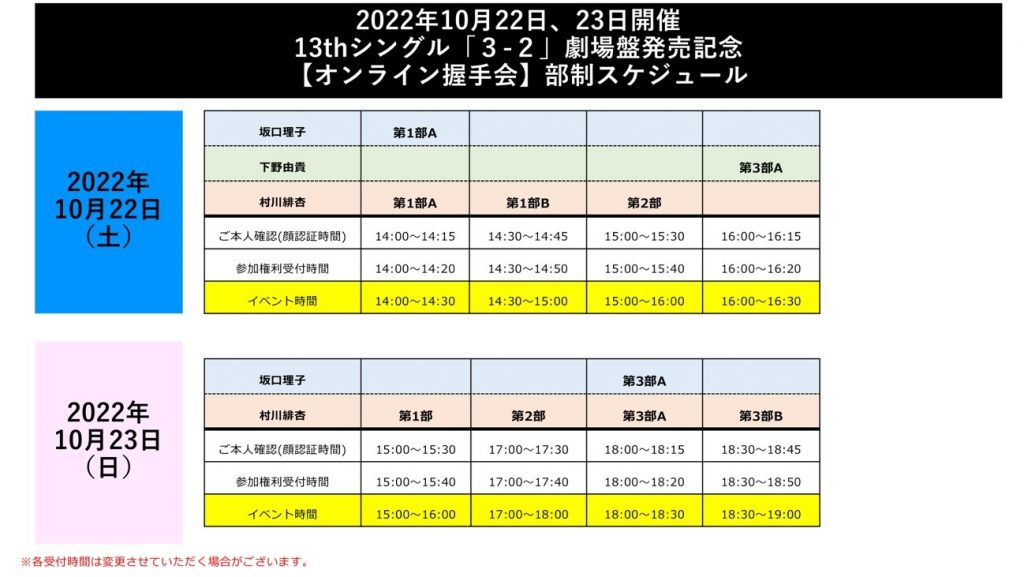 2022年10月22日(土)、23日(日)振替開催 坂口理子、下野由貴、村川緋杏「オンライン握手会」「オンラインロング握手会」につきまして