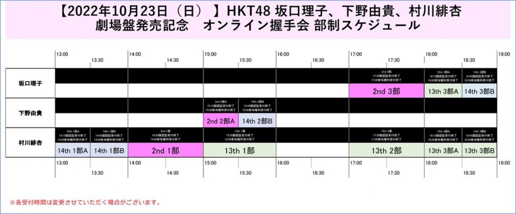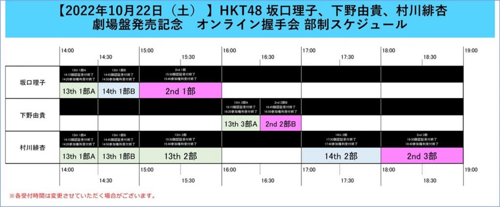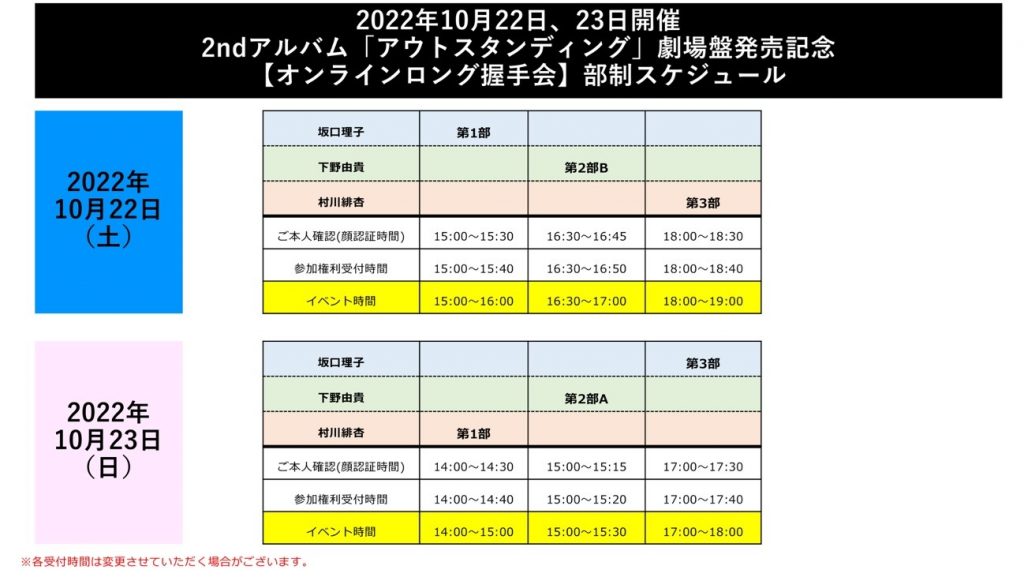 ※「オンライン握手会」の受付(使用枚数選択)は、各部「イベント終了時間」の20分前に終了させていただきます。