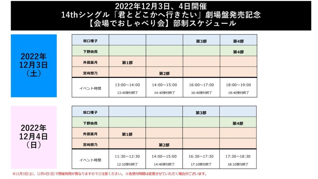 先般、卒業発表いたしました坂口理子・下野由貴・外薗葉月・宮崎想乃につきまして、2022年12月3日(土)、4日(日)に14thシングル『君とどこかへ行きたい』劇場盤発売記念「会場でおしゃべり会」「オンライン握手会」振替開催が決定しましたのでお知らせいたします。