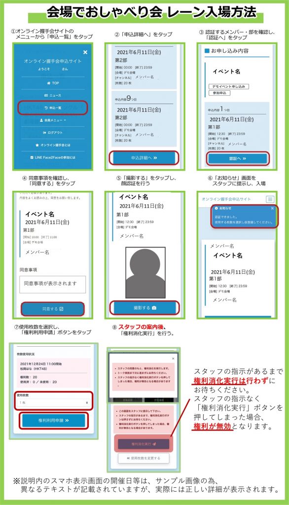 <「会場でおしゃべり会」ご参加の流れ[レーン入場~権利使用につきまして]>