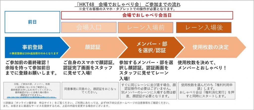「会場でおしゃべり会」は、従来の「握手会」で使用しておりました紙の「参加券」の発行をなくし、お客様のスマートフォンを用いた新たなシステムの導入しております。