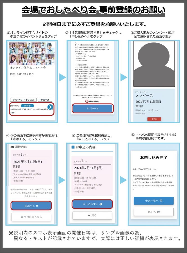 「オンライン握手会申込サイト」への登録は事前にPCなどでお済ませください。