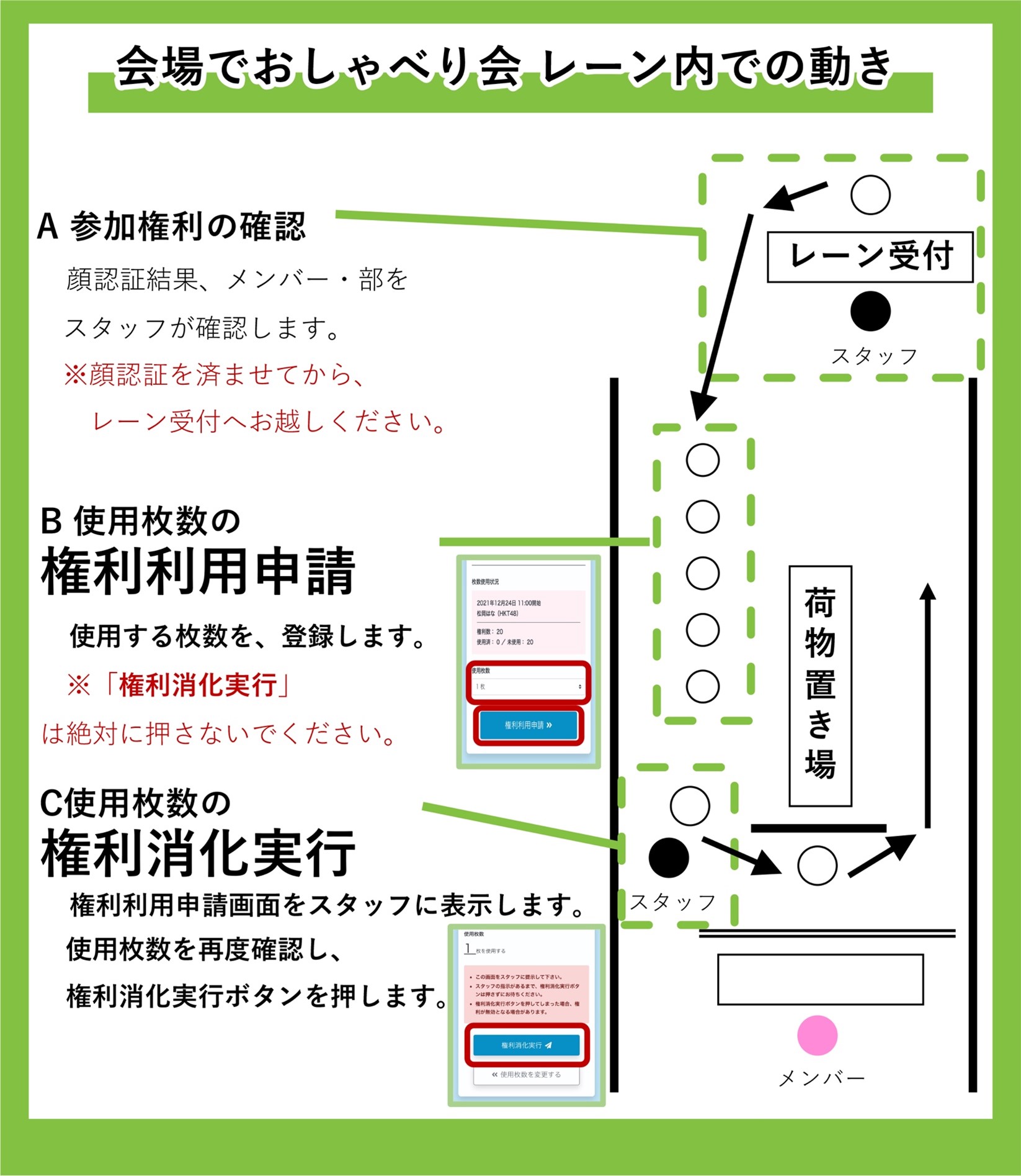 <「会場でおしゃべり会」ご参加の流れ[レーン入場~権利使用につきまして]>