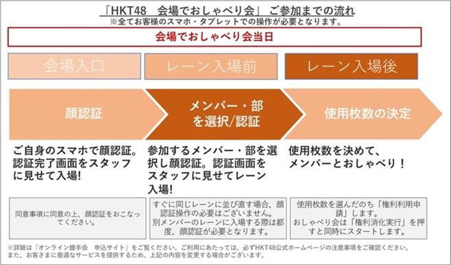 「会場でおしゃべり会」は、従来の「握手会」で使用しておりました紙の「参加券」の発行をなくし、お客様のスマートフォンを用いた新たなシステムの導入しております。