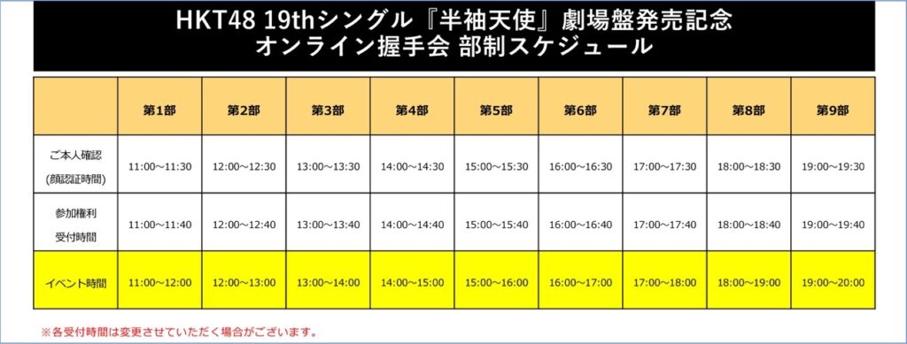 ※「オンライン握手会」の受付(使用枚数選択)は、各部「イベント終了時間」の20分前に終了させていただきます。