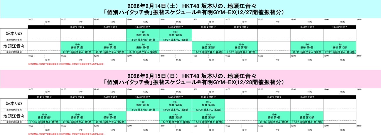 2026年2月14日(土)15(日)に開催いたします HKT48 坂本りの、地頭江音々 19thシングル劇場盤発売記念「個別ハイタッチ会」の振替イベントのご参加方法につきましてご案内いたします。