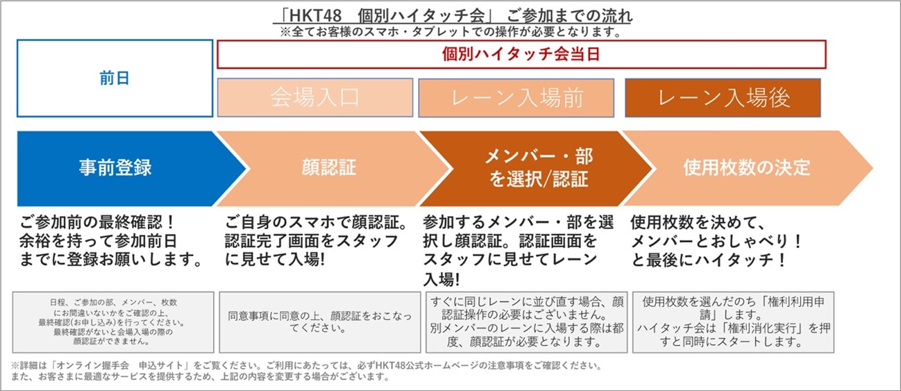 「個別ハイタッチ会」は、従来の「握手会」で使用しておりました紙の「参加券」の発行をなくし、お客様のスマートフォンを用いたシステムを導入しております。