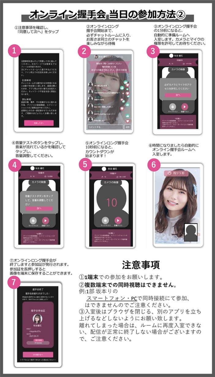 ・注意事項をお守りいただけない場合は「オンライン握手会」にご参加いただけなくなる場合もございます。また、「オンライン握手会」自体が中止になる場合もございます。参加されるお客様のご理解とご協力をお願いいたします。