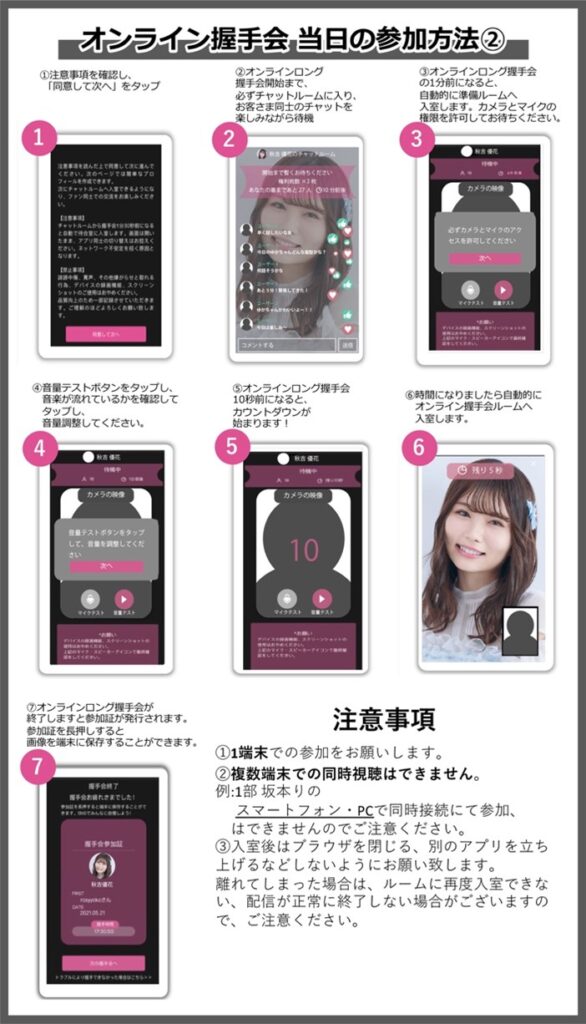 ・待機中、「オンライン握手会」中は、ご利用の端末を移動させないようお願いします。