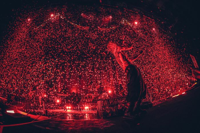 なお、客席は、心置きなく暴れたい人のためのモッシュピットエリア(男女ブロック別)やアイランドサークルエリア(男女混成)をはじめ、フロア後方には親子連れでも安心なファミリーベンチエリア、落ち着いて楽しみたい人向けの座席指定エリアなど、観客の観覧スタイルに合わせたレイアウトが施されているのも特筆すべきポイントだろう。年間50本近く、あるいはそれ以上のステージに立ち続け、ライヴを知り尽くしたHYDEだからこそ成せる細やかな配慮。誰もが自由に楽しめる空間がそこには広がっていた。