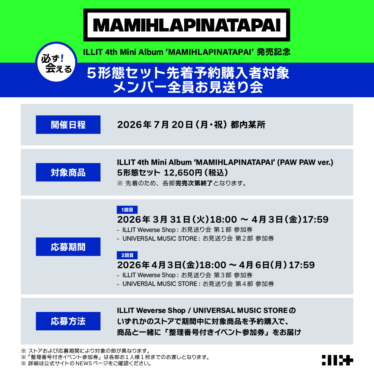 下記販売サイトにて「【第●部メンバー全員お見送り会参加券付き】ILLIT 4th Mini Album ‘MAMIHLAPINATAPAI’ (PAW PAW ver.) 5形態セット」を1セットご予約 (ご決済完了)いただいたお客様に、メンバー全員お見送り会にご参加いただける「整理番号付きイベント参加券」を1枚、商品と同梱でお送りいたします。